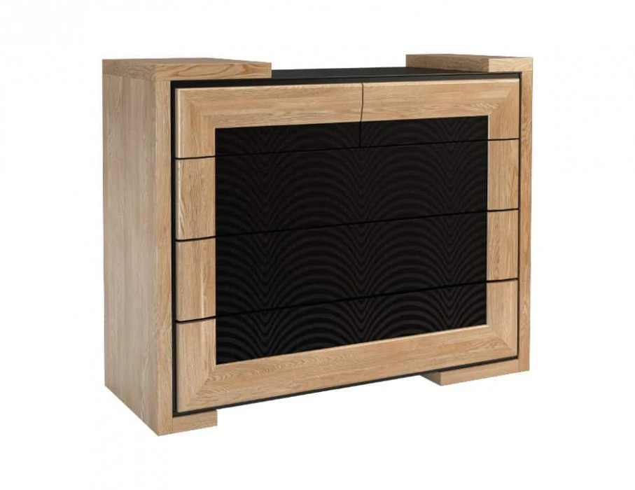 Komoda 5SZ z kolekcji Corino to elegancki mebel do przechowywania, który łączy funkcjonalność z wyjątkowym designem. Fronty z litego drewna dębowego z dekoracyjną tkaniną oraz szklany blat Lacobel nadają komodzie nowoczesny i stylowy wygląd.