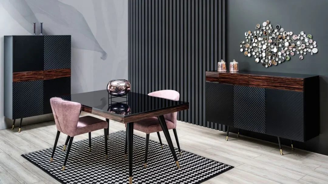 Komoda z kolekcji Arte to elegancki mebel w stylu modern classic, doskonały do salonu lub sypialni. Korpus w czarnym połysku harmonijnie łączy się z frontami szuflad z hebanu makassar, lakierowanymi na wysoki połysk.