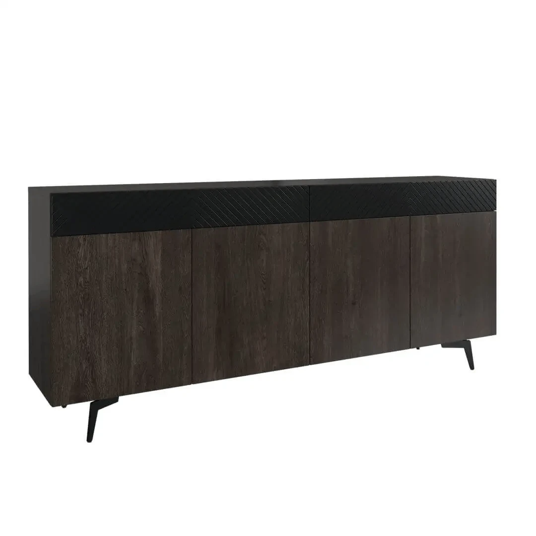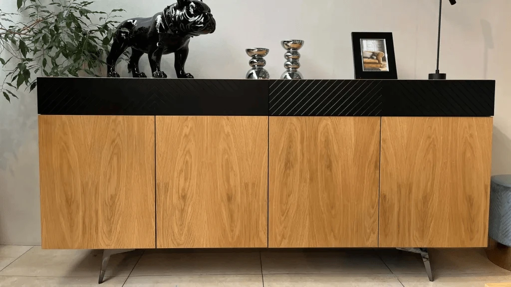 Komoda Larice to elegancki mebel z charakterystycznym wzorem jodełki na czarnych frontach szuflad, który podkreśla jej unikalny charakter. Korpus wykonany z fornirowanego dębu naturalnego zachwyca jakością i trwałością.