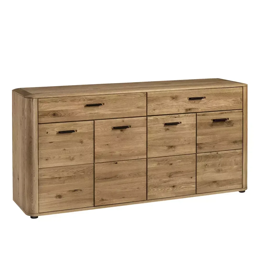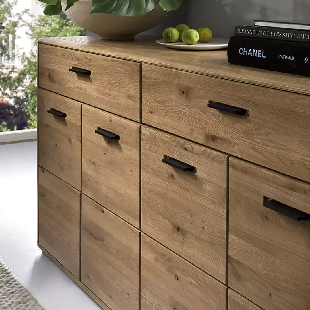 Komoda Monaco to pojemny mebel o wyraźnie zaoblonych krawędziach – detalu charakterystycznym dla całej kolekcji. Wykonana z litego drewna dębowego i naturalnej okleiny, zachwyca solidnością i szlachetnym wykończeniem.