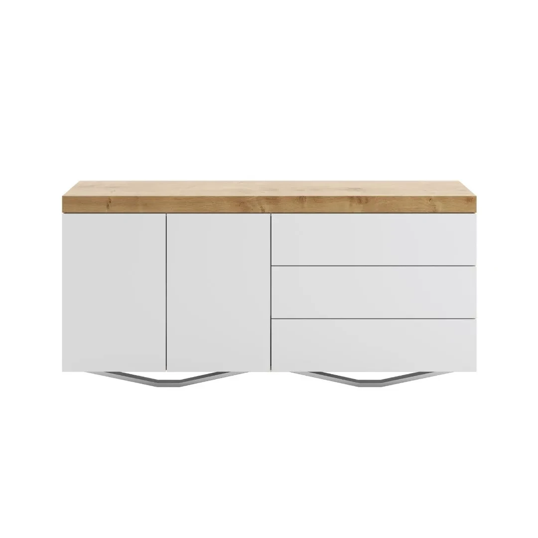 Nowoczesna, pojemna komoda, która łączy w sobie styl i funkcjonalność. Fronty i korpus wykończone na biały połysk, a blat pokryty naturalną okleiną dębową w półmacie, co dodaje ciepła i elegancji.