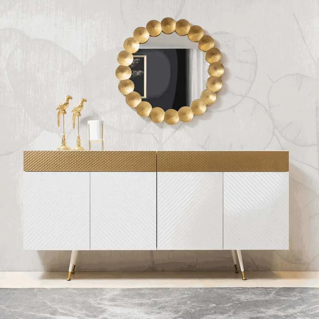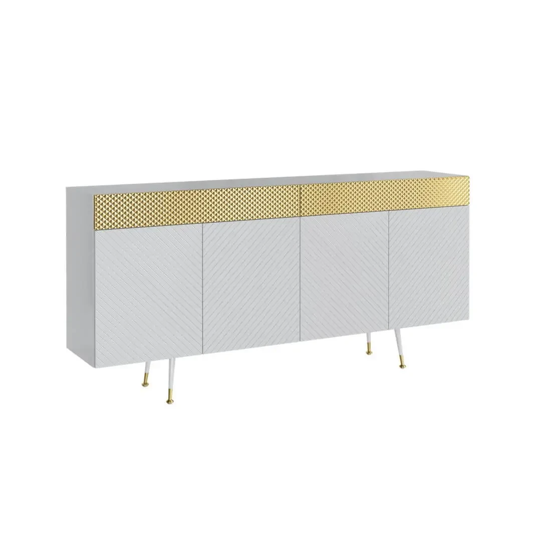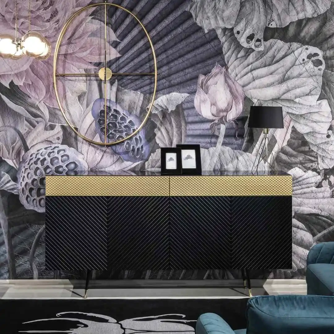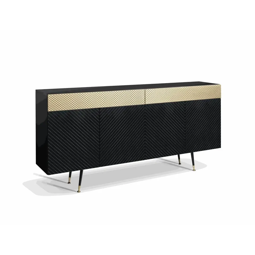 Duża, luksusowa komoda Rubin to propozycja dla osób ceniących nowoczesny styl i funkcjonalność. Korpus w czarnym połysku zestawiono z ryflowanymi frontami – czarnymi u dołu i złotymi u góry, tworząc wyjątkowo elegancki kontrast.