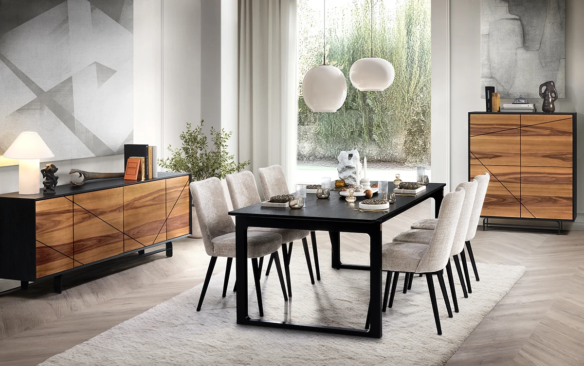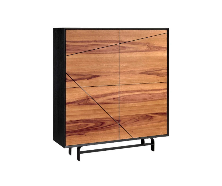 Wysoka komoda z kolekcji Verano oferuje 4 zamykane przestrzenie za frontami z naturalnej okleiny orzecha amerykańskiego.