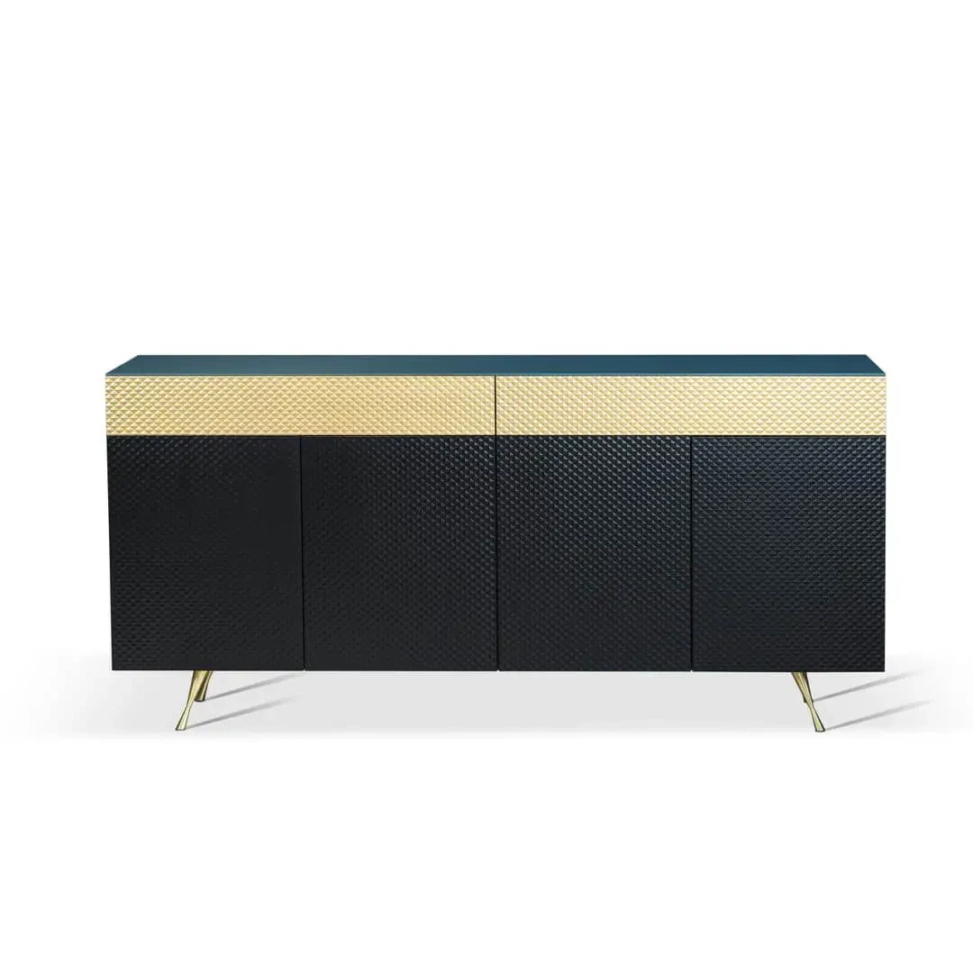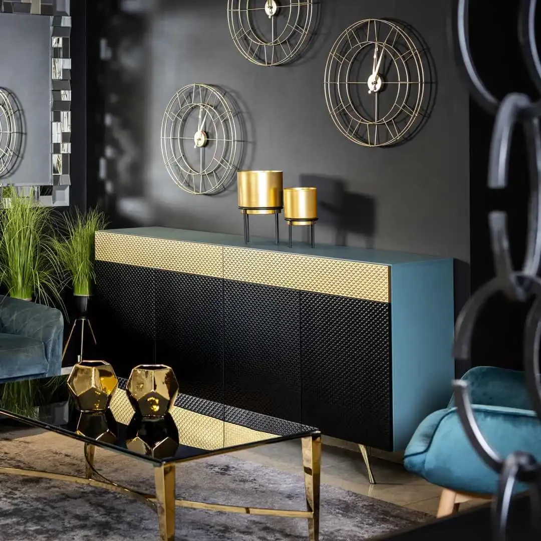 Wyrazisty korpus w kolorze petrol, ryflowane czarne fronty i złote szuflady tworzą luksusową, a zarazem spójną całość.