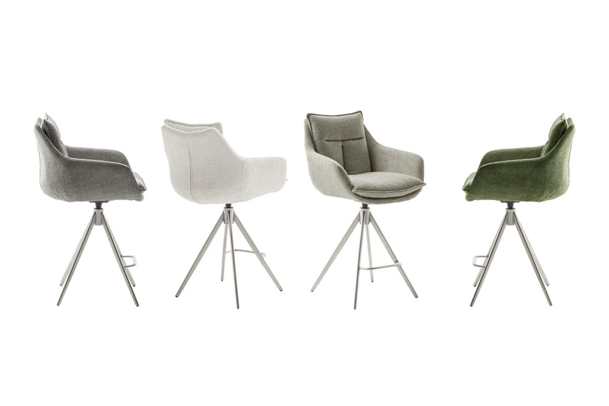 Siedzisko zostało tapicerowane miękką tkaniną, zapewniając komfortowe i przyjemne w dotyku miejsce do siedzenia. Stabilną podstawę stanowi stelaż ze stali szlachetnej szczotkowanej, który łączy trwałość z nowoczesnym, stylowym wyglądem.