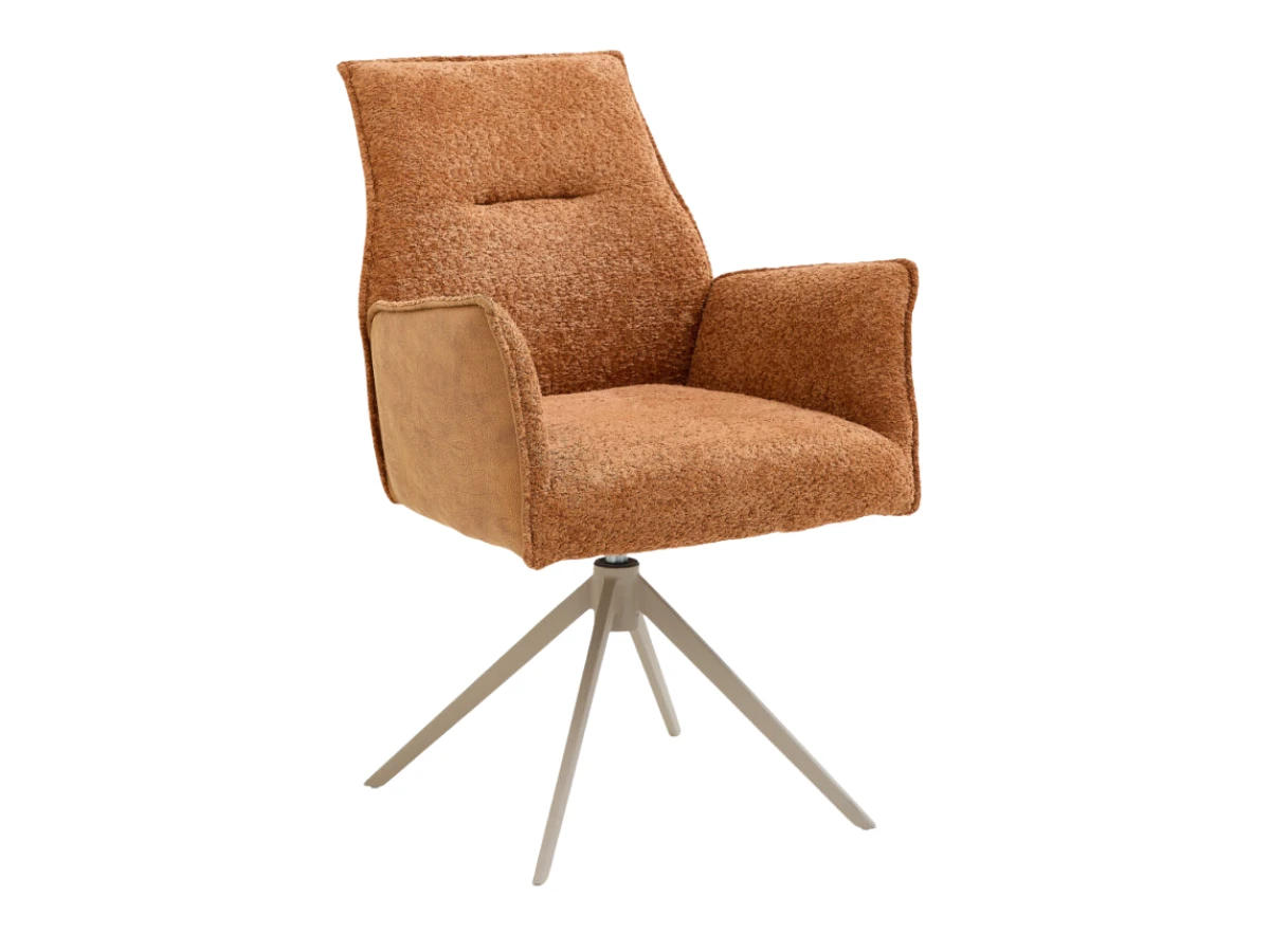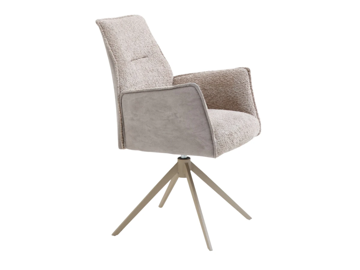 Krzesło posiada cztery skośne nogi w kolorze metal lub czarny mat, które stabilnie podpierają konstrukcję i dodają jej nowoczesnego charakteru. Dodatkowo siedzisko wyposażone jest w obrót 360° z automatycznym mechanizmem powrotnym, co zwiększa komfort użytkowania i praktyczność na co dzień.