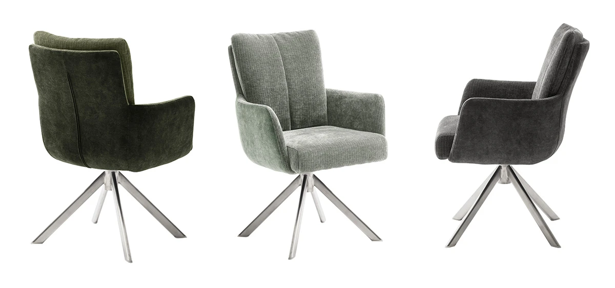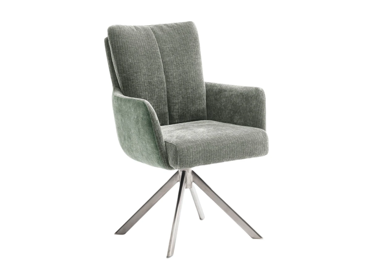 Przód siedziska w tkaninie o fakturze sztruksu, tył w welurze w pastelowej zieleni, co tworzy elegancki i nowoczesny efekt.
