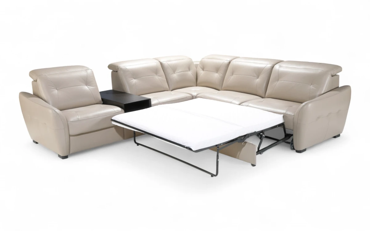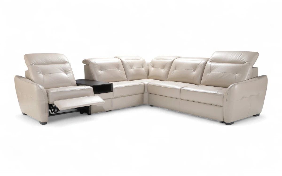 Narożnik modułowy Cotto wyposażony jest w barek z funkcją chłodzenia napojów, sprawdzi się podczas spotkań, wieczorów filmowych i codziennego relaksu.