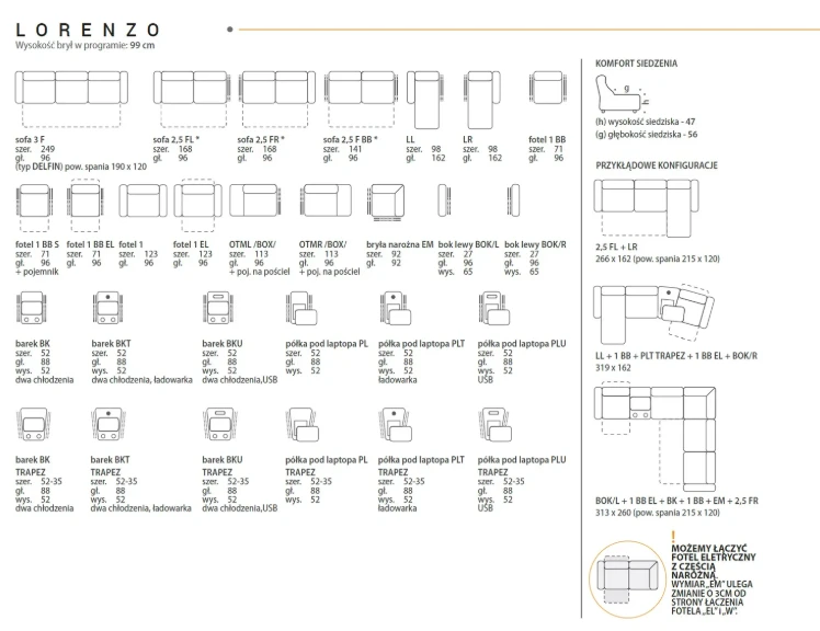 Dodatkowy pojemnik na pościel w module longchair zwiększa praktyczność zestawu, a obrotowa drewniana półka pod laptopa oraz ładowarka bezprzewodowa do smartfona wprowadzają nowoczesny komfort użytkowania.