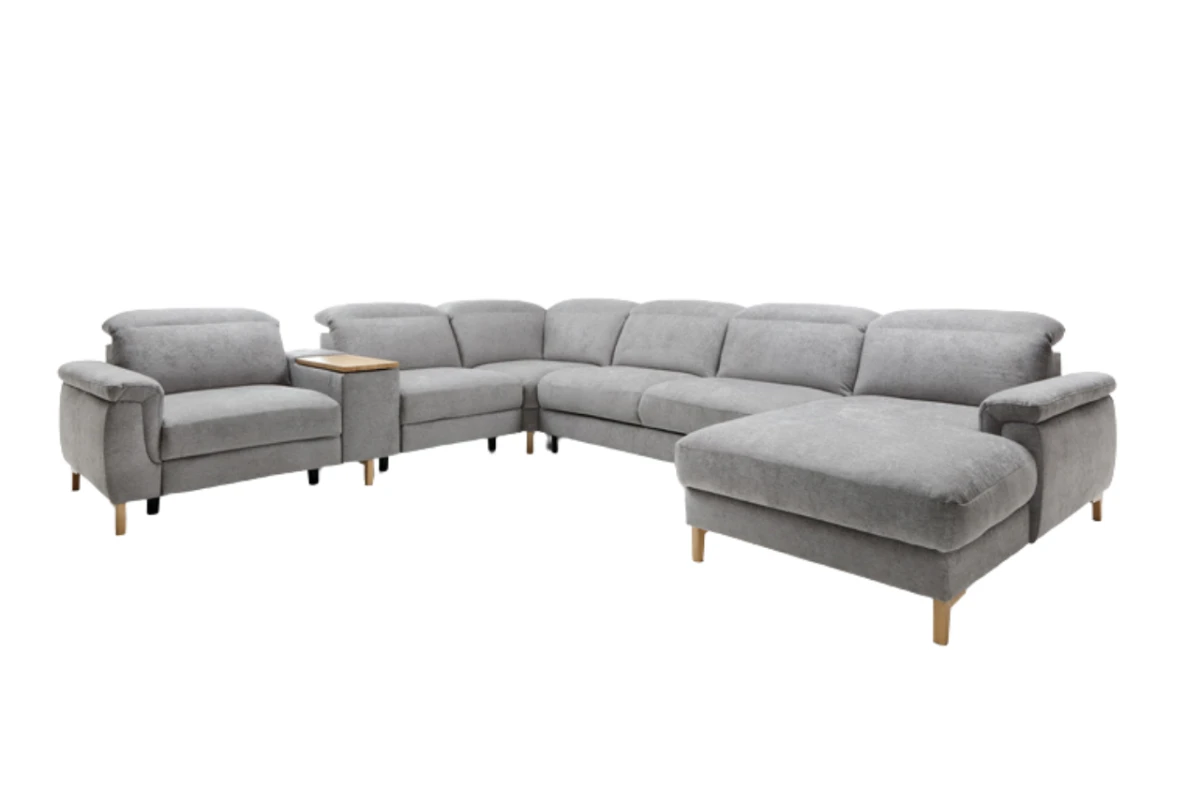 Narożnik wyposażony jest w nowoczesne funkcje, takie jak elektryczny fotel z relaksem i zabudowanym podnóżkiem, komputerowa półka z USB i gniazdkiem sieciowym, dotykowa lampka LED z regulacją jasności oraz funkcja spania typu włoskiego z pojemnikiem na pościel.