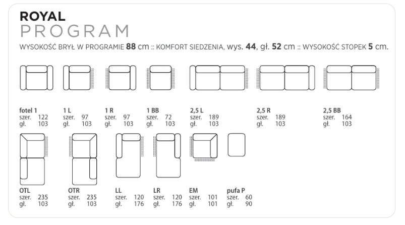 Solidna konstrukcja gwarantuje trwałość na lata, a miękkie poduszki otulają komfortem po intensywnym dniu. Uniwersalna forma oraz eleganckie tkaniny sprawiają, że Royal łatwo dopasowuje się do różnych aranżacji wnętrz.