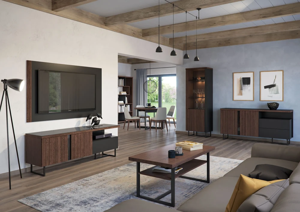 Dzięki kompaktowym wymiarom doskonale sprawdzi się zarówno w mniejszych, jak i większych wnętrzach. Ciepły odcień mocca podkreśla jego uniwersalny, nowoczesny charakter.