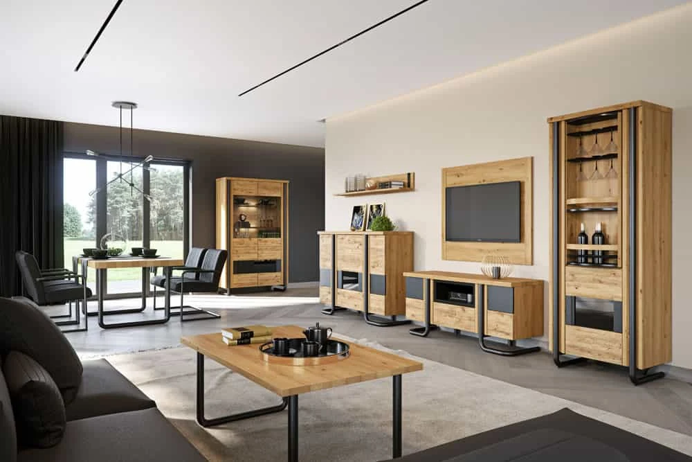 Stolik Omega to połączenie naturalnych materiałów z nowoczesną formą. Kwadratowy blat wykonany z naturalnej okleiny dębowej o wyrazistym, sękatym rysunku spoczywa na solidnych, czarnych metalowych nogach, które dodają mu lekkości i charakteru.