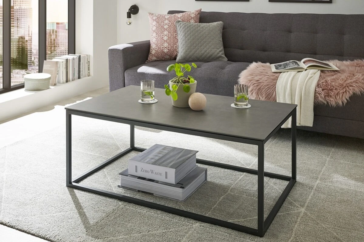 Stolik kawowy Varna wyróżnia się blatem wykonanym z połączenia szkła i ceramiki w kolorze antracytowym, co nadaje mu wyjątkowy, subtelnie industrialny charakter.