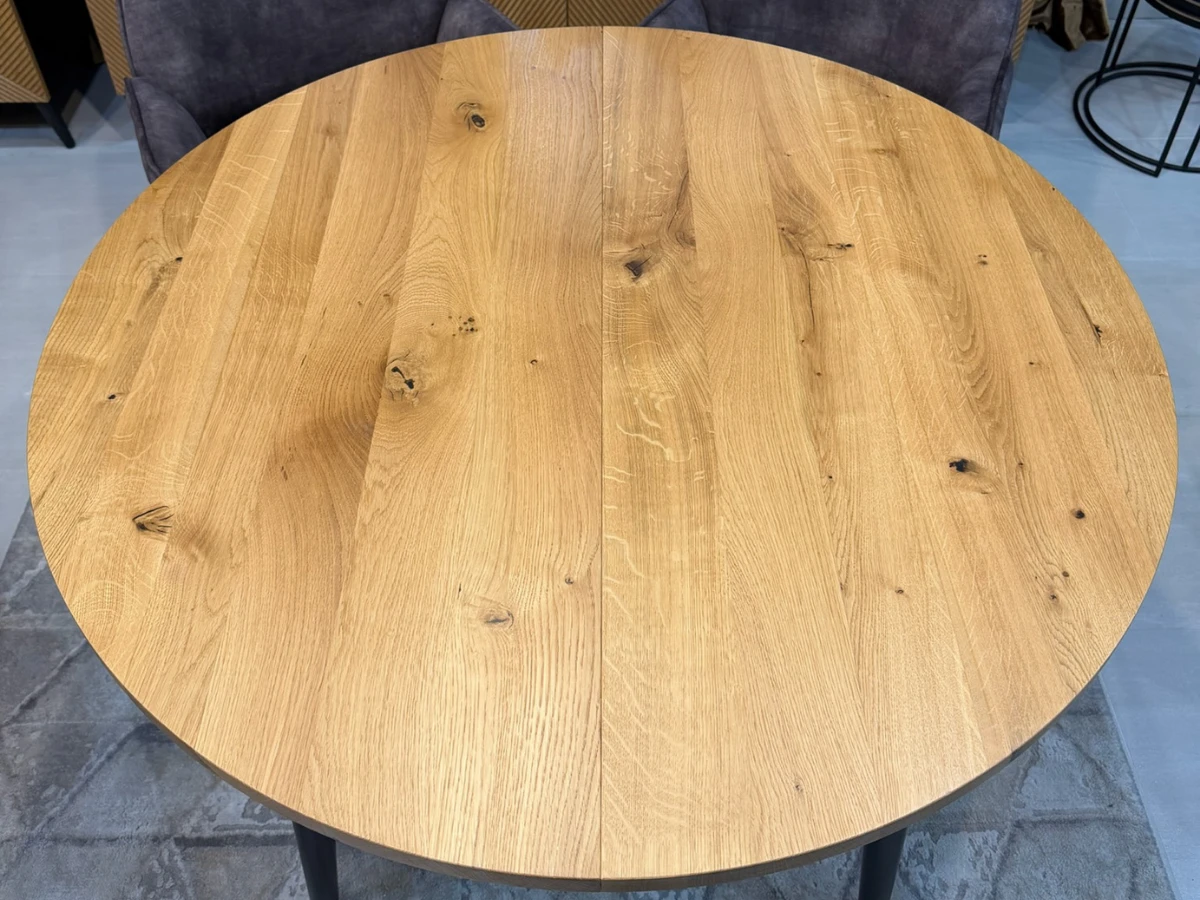 Okrągły stół wykonany z litego drewna, z widocznymi naturalnymi słojami.