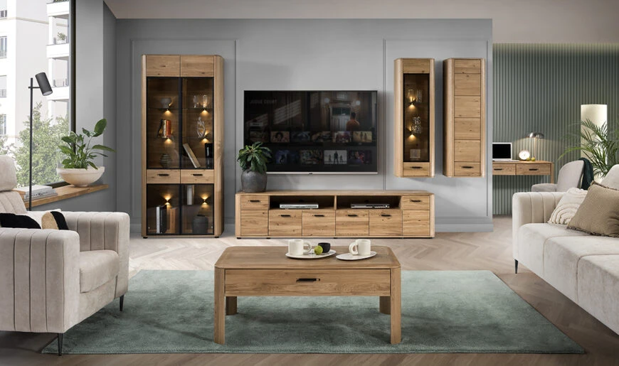 Fronty wykonano w 100% z litego dębu, a zewnętrzny korpus z naturalnej okleiny dębowej z elementami litego drewna. Wnętrze mebla stanowi płyta laminowana w kolorze dąb tajga. Uzupełnieniem są czarne metalowe uchwyty oraz zawiasy samodomykające, które zwiększają komfort użytkowania.