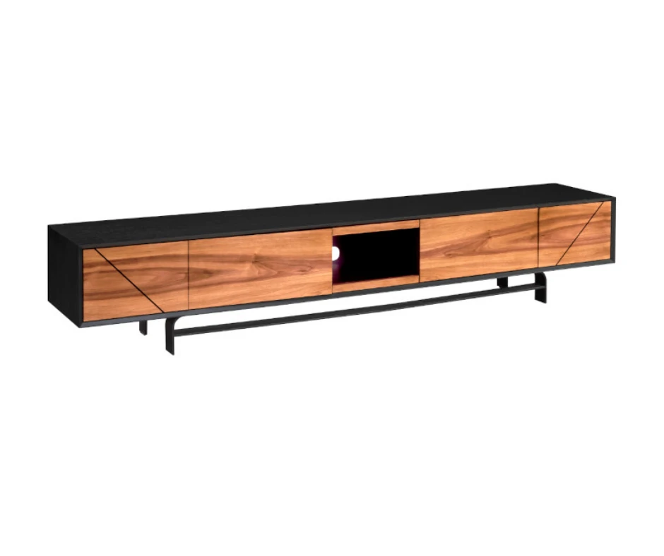 Duża szafka RTV Verano to połączenie elegancji naturalnej okleiny orzecha amerykańskiego z trwałością dębowego korpusu. Posiada 4 drzwi, które skrywają pojemne półki, a dodatkowa wnęka zapewnia wygodne miejsce na sprzęt multimedialny.