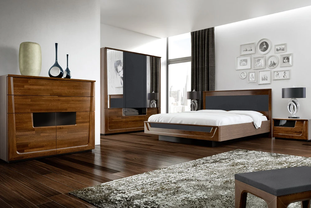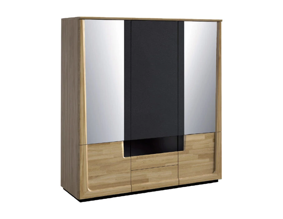 Fronty zostały wykonane z litego drewna dębowego, tkaniny obiciowej, szkła Lacobel oraz lustra, co nadaje szafie niepowtarzalny, wyrafinowany wygląd.