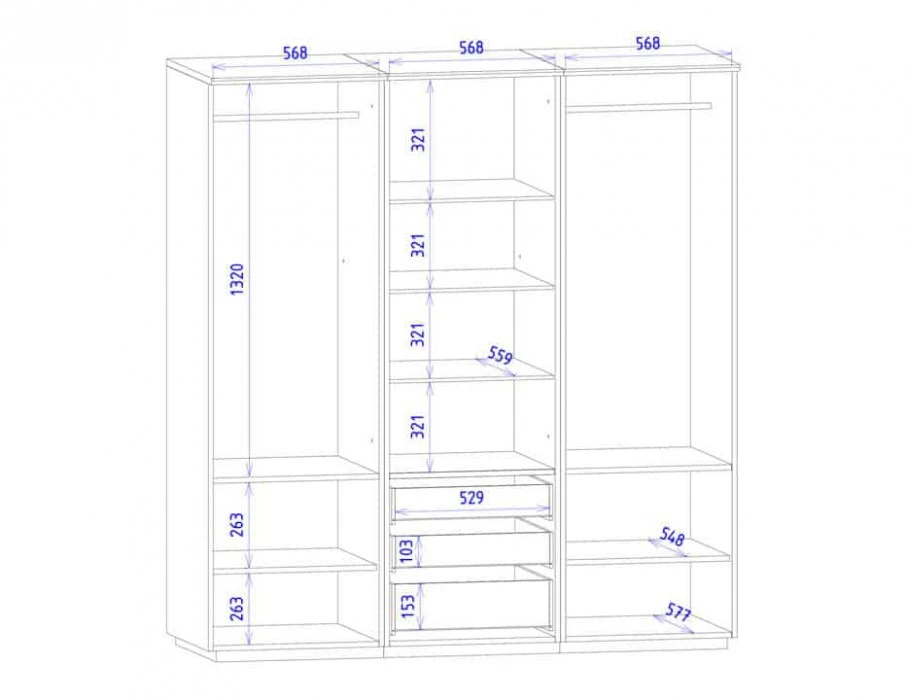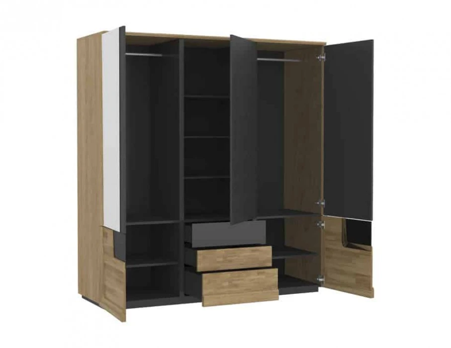 Wnętrze kryje 5 lakierowanych półek i 2 drążki na wieszaki, oferując funkcjonalną przestrzeń do przechowywania odzieży i dodatków.