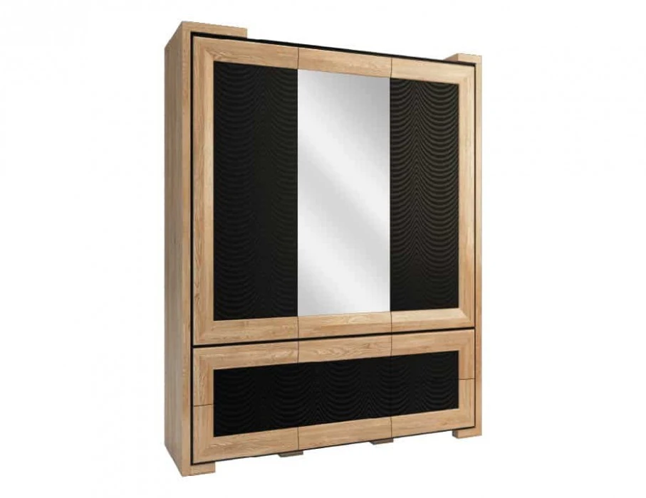 Szafa 3D wysoka z kolekcji Corino to elegancki mebel z frontami z drewna dębowego, lustra i tkaniny.